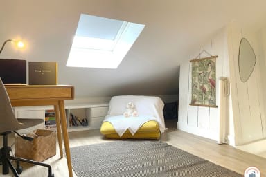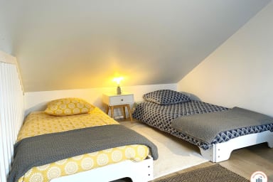 - Upstairs, under the roofs, 2 small single beds and a desk allowing those who wish to enjoy the Normandy air to telecommute.