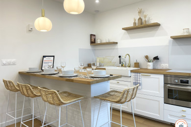 - Una amplia sala de estar muy luminosa con cocina abierta a un espacio de sala de estar/comedor que ofrece una magnÃfica vista a Deauville con una pequeña vista al mar.