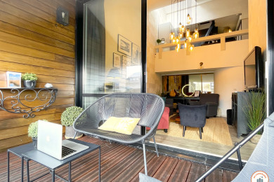 - Au niveau inférieur : Un beau salon équipée d'une Smart TV, donnant sur une belle terrasse avec salon de jardin. La terrasse offre un point de vue magnifique sur la marina et le casino ; Une cuisine tout équipée (four, micro-ondes, lave vaisselle, cafetière, bouilloire, etc.) ouverte sur un espace salle à manger pouvant accueillir 6 convives.