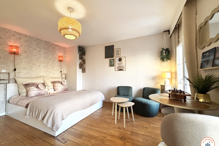 - Une bel espace chambre/salon. Equipé d'une literie Queen size de qualité en 160x200cm, d'un petit espace détente, d'une table pour déjeuner et une Smart TV avec Netflix.