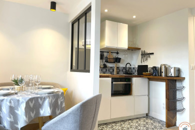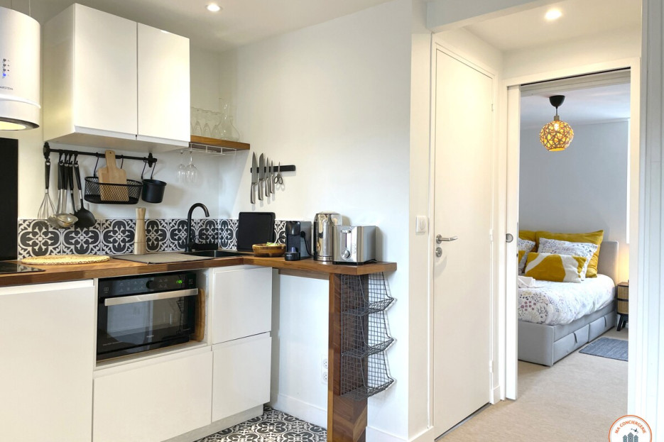 - Une pièce à vivre avec cuisine ouverte entièrement équipée sur un petit coin salon pour 4 personnes (réfrigérateur, four, plaque induction, lave-vaisselle, machine à café (Nespresso), rangements, ustensiles de cuisine, …) ;